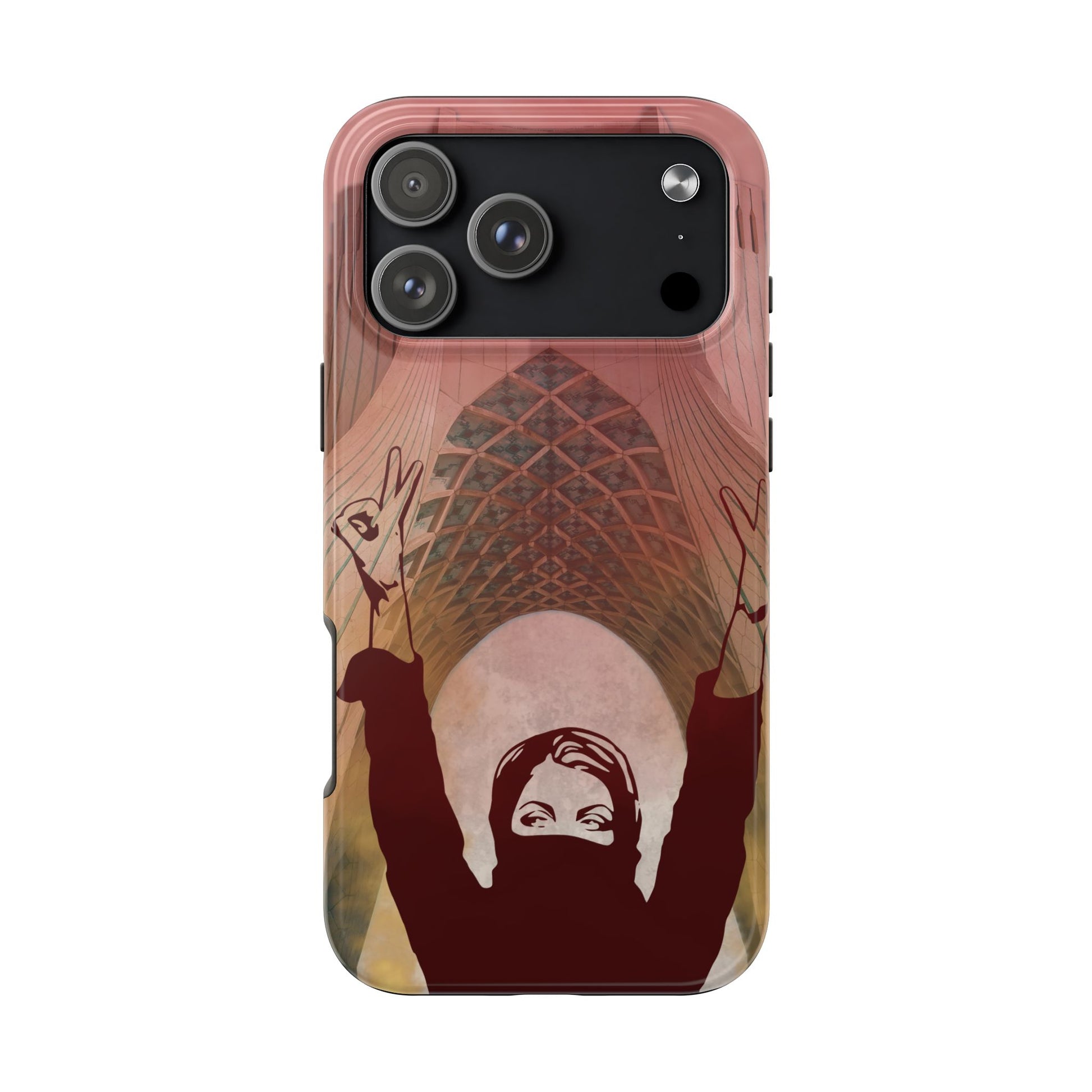 A protective phone case that brings attitude and style to your daily carry. The design layers a defiant, masked figure throwing up peace signs against an architectural, cathedral-like backdrop with warm, sunlit tones. The glossy surface adds depth to the artwork while the robust two-piece construction keeps your device safe from drops and everyday bumps. It feels sturdy in the hand yet slim enough to slide into pockets. Wear the image like a quiet declaration — urban, art-forward, and unapologetic.